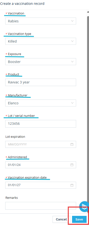 Save — Click Save. The record will automatically appear on the certificate. Verify the checkmark is next to the vaccine name, as this indicates it will be added to the certificate.