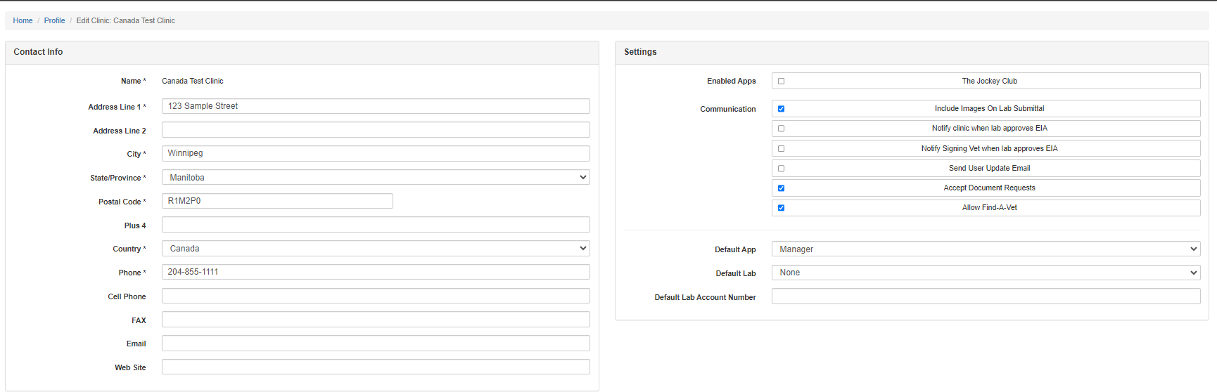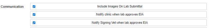 • The box at the top right of the screen is the Settings box. In the Communication section of the Settings box you will see "Notify clinic when lab approves EIA" and "Notify Signing Vet when lab approves EIA".
