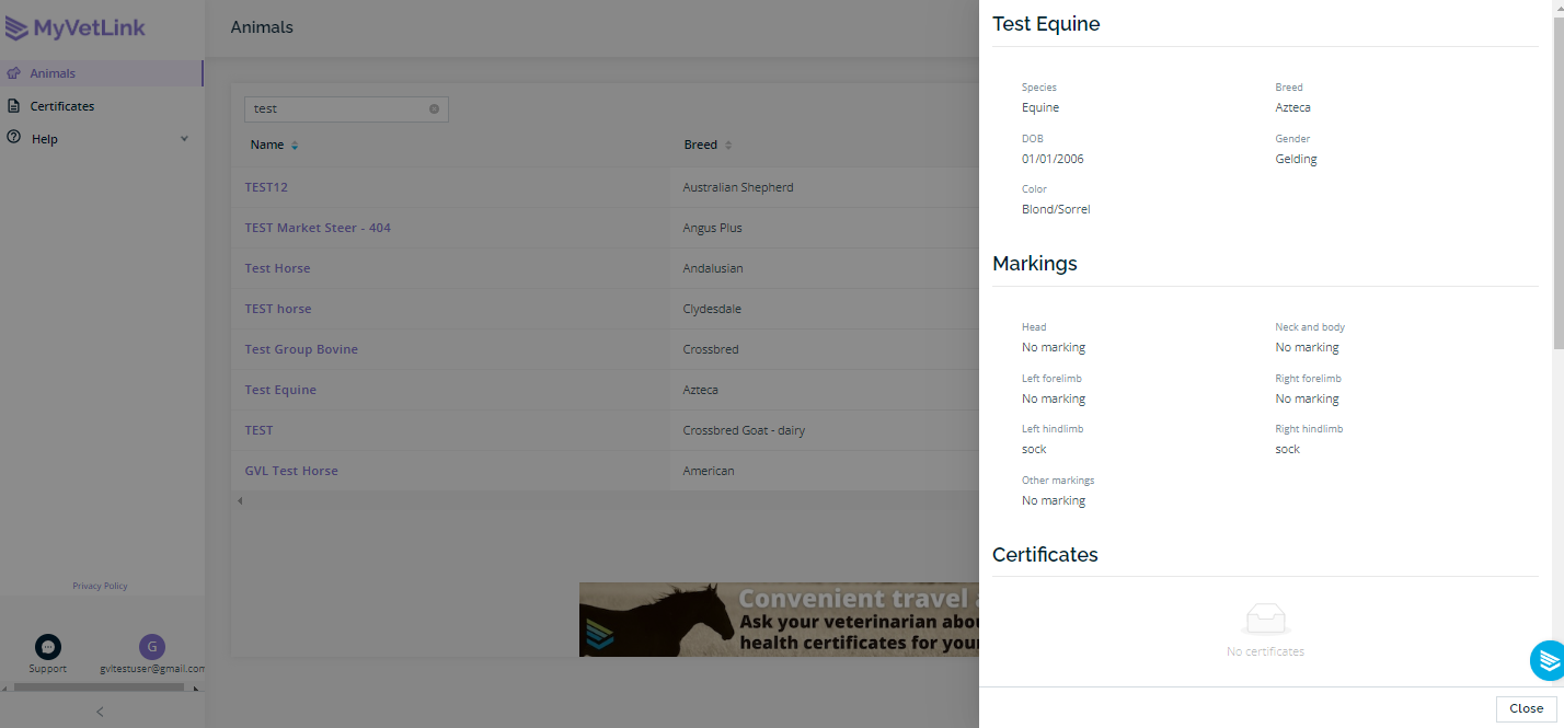 When a client has signed up for an MVL account, they will be able to log in and view animals listed under their ownership, along with their completed certificates.